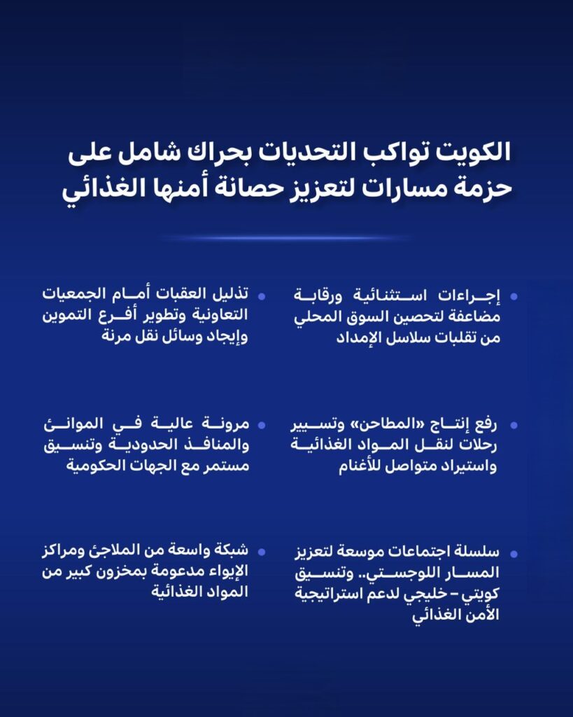 وتقاطعت الجهود الكويتية الداخلية مع تنسيق خليجي رفيع المستوى للتأكيد على مواصلة تنفيذ مبادرات استراتيجية الأمن الغذائي لدول مجلس التعاون المعتمدة في نوفمبر 2025 بدولة الكويت بما يعزز استدامة الأمن الغذائي في دول المجلس إضافة إلى أهمية تسهيل إجراءات العبور والتخليص الجمركي وتعزيز كفاءة النقل البري والبحري والجوي وتوفير مسارات لوجستية مرنة.