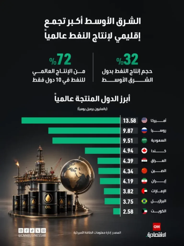 وفي قلب هذه المعادلة، يبرز الشرق الأوسط كأكبر تجمع إقليمي لإنتاج النفط عالميًا، بإسهام يصل إلى 32% من الإنتاج العالمي، مدفوعًا بدور دول رئيسية مثل السعودية والعراق والإمارات والكويت وإيران. ورغم تصدر الولايات المتحدة قائمة أكبر المنتجين منفردة، فإن الثقل الجماعي لدول المنطقة يظل عنصرًا حاسمًا في توازن العرض العالمي.(CNN الاقتصادية)